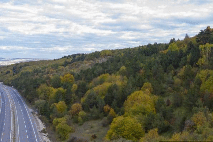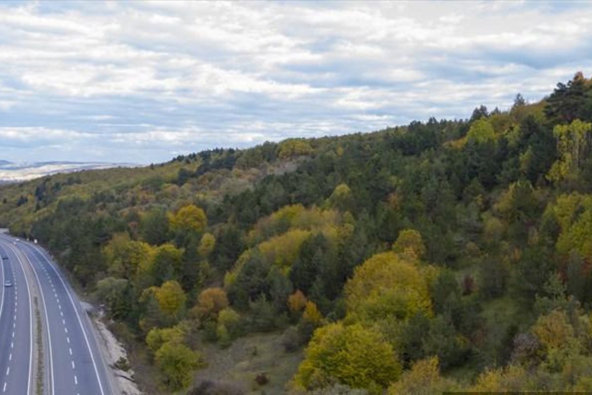 From above, the D-100 appears like a dark ribbon weaving through a mosaic of dense forests now glowing with the vibrant hues of autumn — golden yellows, deep oranges, and fiery reds. The surrounding countryside reflects the seasonal transformation of Bolu’s rich natural landscape, where deciduous trees blanket the hillsides and mountain slopes. The nearby Lake Yenicaga and surrounding wetlands add to the scenic beauty of the region, attracting local and international photographers, as well as birdwatchers who come to observe migratory species passing through this ecological corridor.